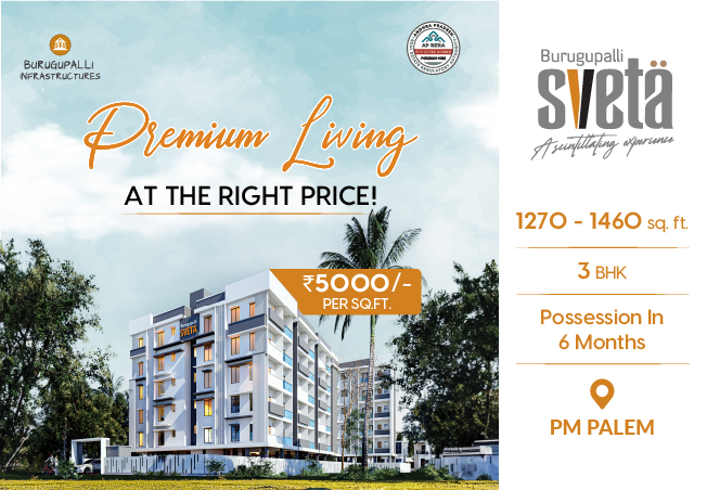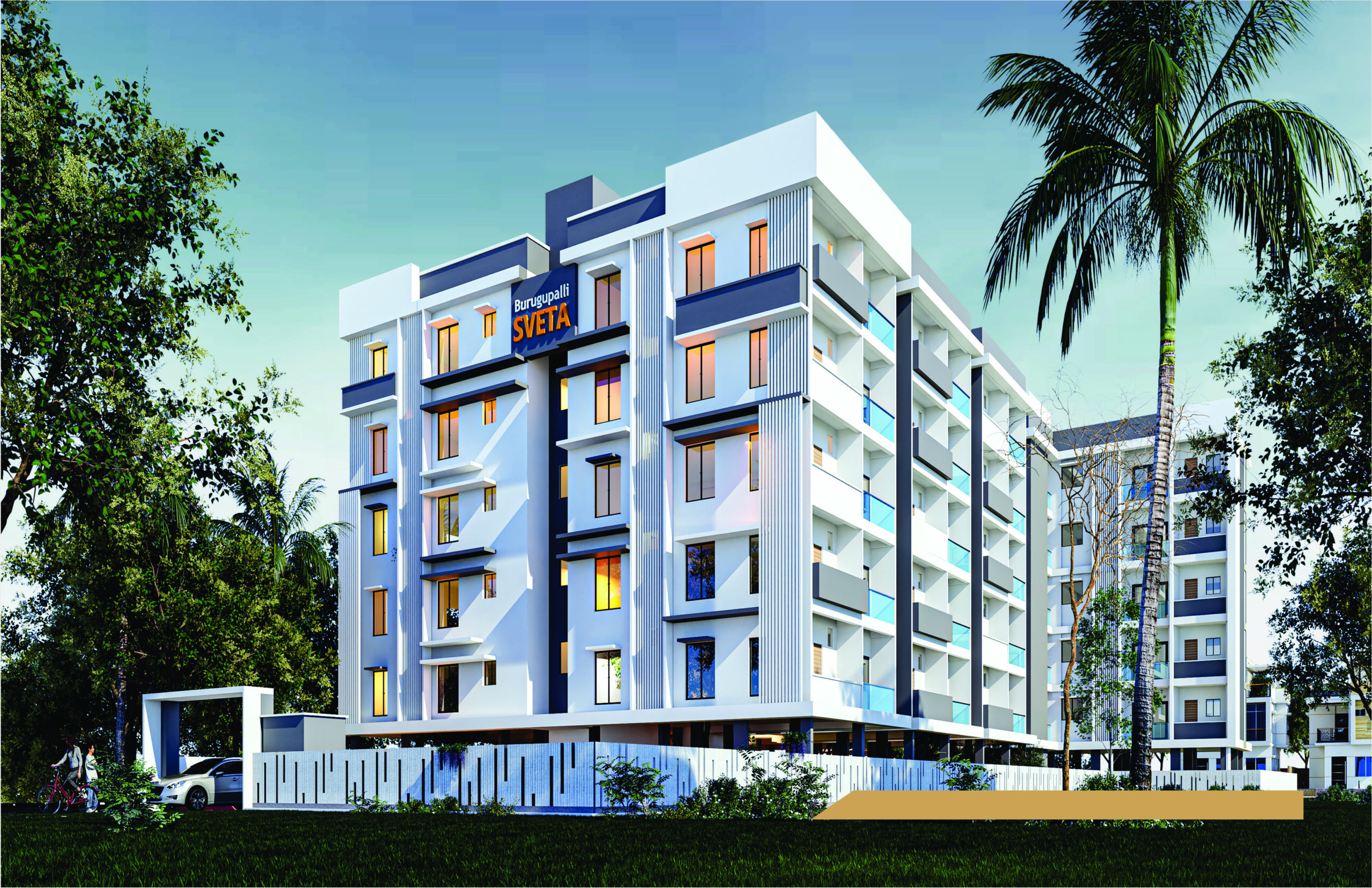 Burugupalli Sveta is a new residential project by Burugupalli Infrastructures located at PM Palem, Madhurawada. This project offers a total of 45 units, Across Two blocks and five levels providing ample options for home buyers. One of the key highlights of this project is its emphasis on green spaces, allowing residents to enjoy a serene and eco-friendly environment. Additionally, there are tot lots available for children to play and Sit-outs on both the ground level and terraces, providing residents with spaces to relax and unwind. With Burugupalli’s commitment to customer satisfaction, highest quality standards, and attention to detail, Burugupalli Sveta is set to be an ideal choice for individuals seeking a comfortable and quality living experience. Burugupalli Sveta is strategically located near the highway, schools, and colleges, making it convenient for residents to access major transportation routes and educational institutions.